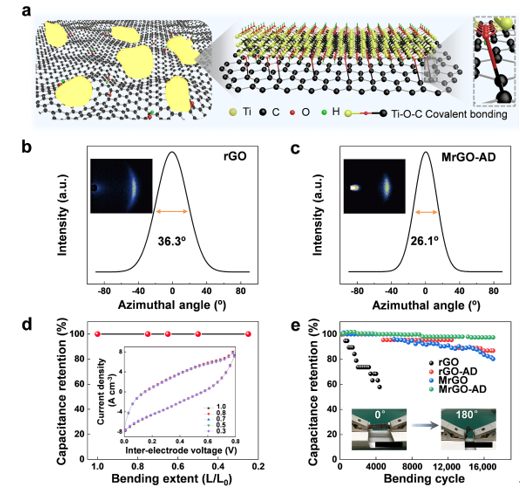 a. Schematic model of MXene-GO platelets showing the formation of Ti–O-C covalent bonding. b-c. Azimuthal scan wide-angle X-ray scattering (WAXS) patterns (for a rotating anode X-ray source) showing the full width at half maximum (FWHM) of rGO (b) and MrGO-AD (c). d. Capacitance retention as a function of the bending extent of the supercapacitor (which is defined as the ratio of the end-to-end separation in the bent supercapacitor to this separation for the non-bent supercapacitor). e. Capacitance retention for supercapacitors based on rGO, rGO-AD, MrGO, and MrGO-AD sheets during up to 17,000 bending cycles to a bending extent of 25% (which corresponds to a 180° angle between supercapacitor ends). Scale bar, 2 cm (inset).