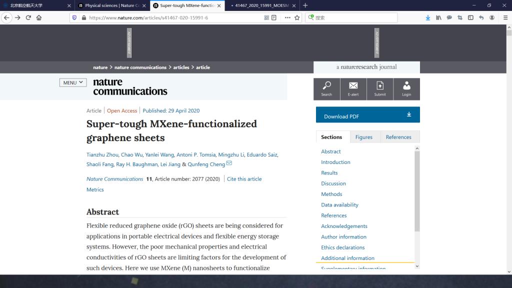 On April 29, a reseach team led by Prof. Cheng Qunfeng from the School of Chemistry published their research results titled "Super-tough MXene-functionalized graphene sheets" in Nature Communications. Zhou Tianzhu, a PhD candidate, Prof. Wu Chao and Associate Research Fellow Wang Yanlei are the first authors. Prof. Cheng Qunfeng is the corresponding author.