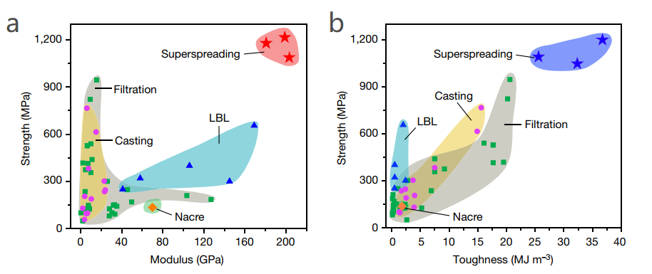 Nanocomposite films demonstrated much higher mechanical properties compared with the reported nanocomposite films prepared by traditional strategies (Fig. 3). In addition, this technique can achieve oriented alignment of nanosheets and a continuous large-scale fabrication of layered nanocomposite films of various polymer polymerization systems in a universal and efficient way.